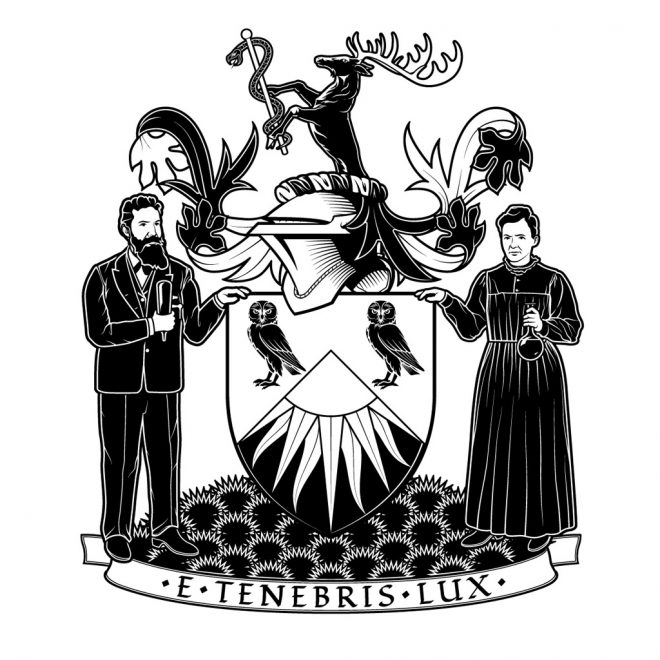 The British Institute of Radiology is currently having their Arms Granted to them by the College of Arms but I have been able to illustrate the design whilst they are awaiting the Grant itself. I was able to work from the approval sketch supplied by the College which features Wilhelm Rontgen and Marie Curie as the supporters.